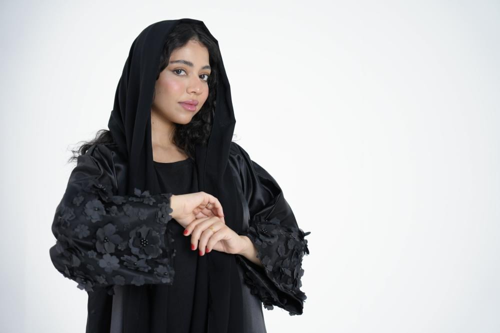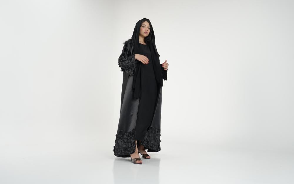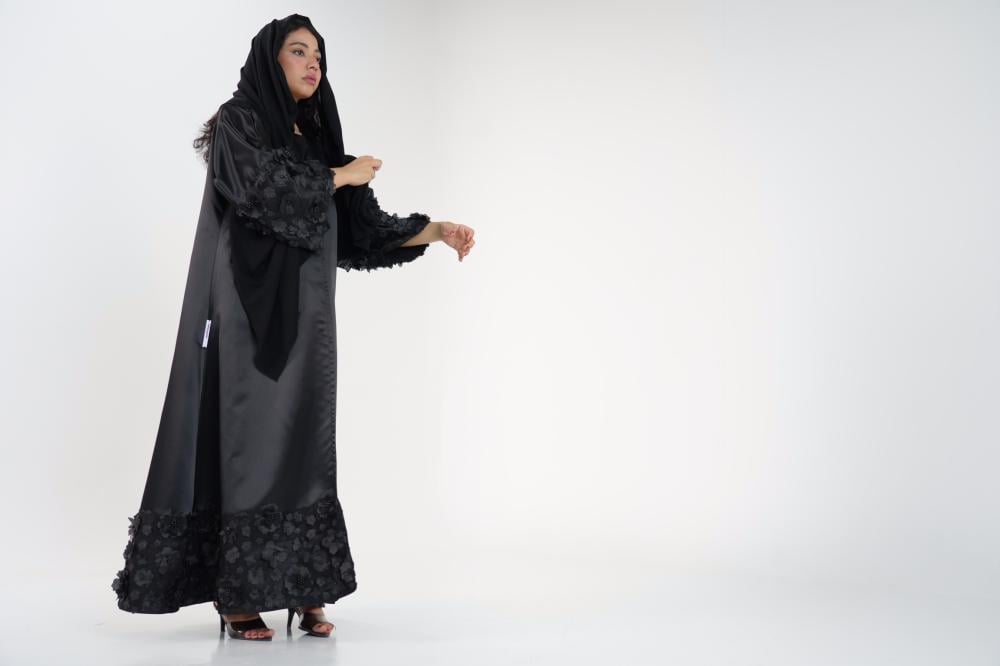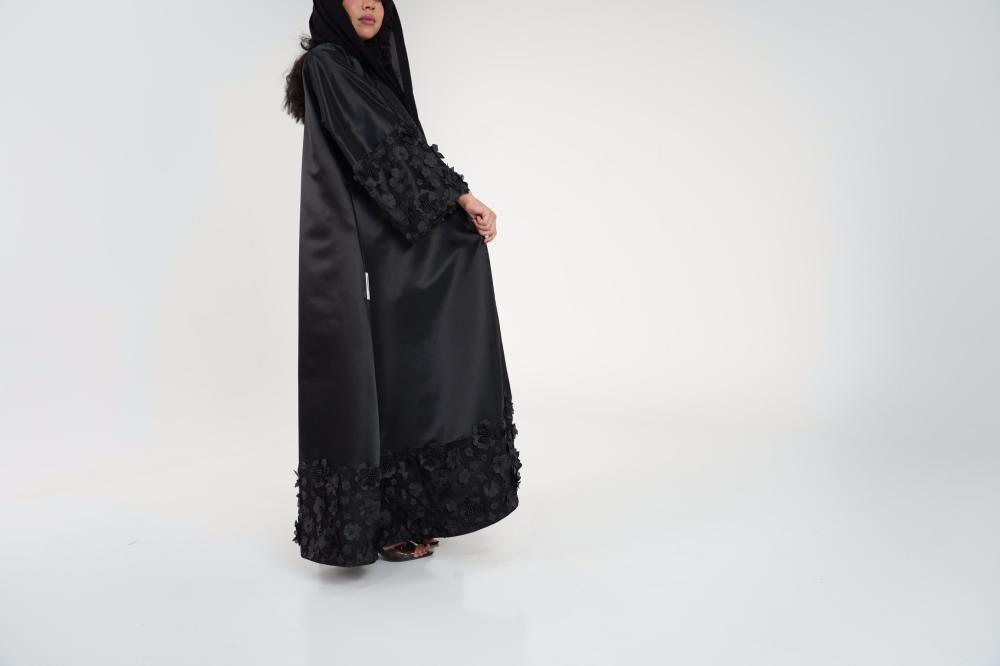 عباية سوداء مسائية وعملية بذات الوقت بتصميم كولوش مع اضافة تصميم الورد المكثفه بالاكمام واسفل العبايه، بقماش التفته الخفيف ليتناسب مع الاجواء الحارة و اللامع قليلا